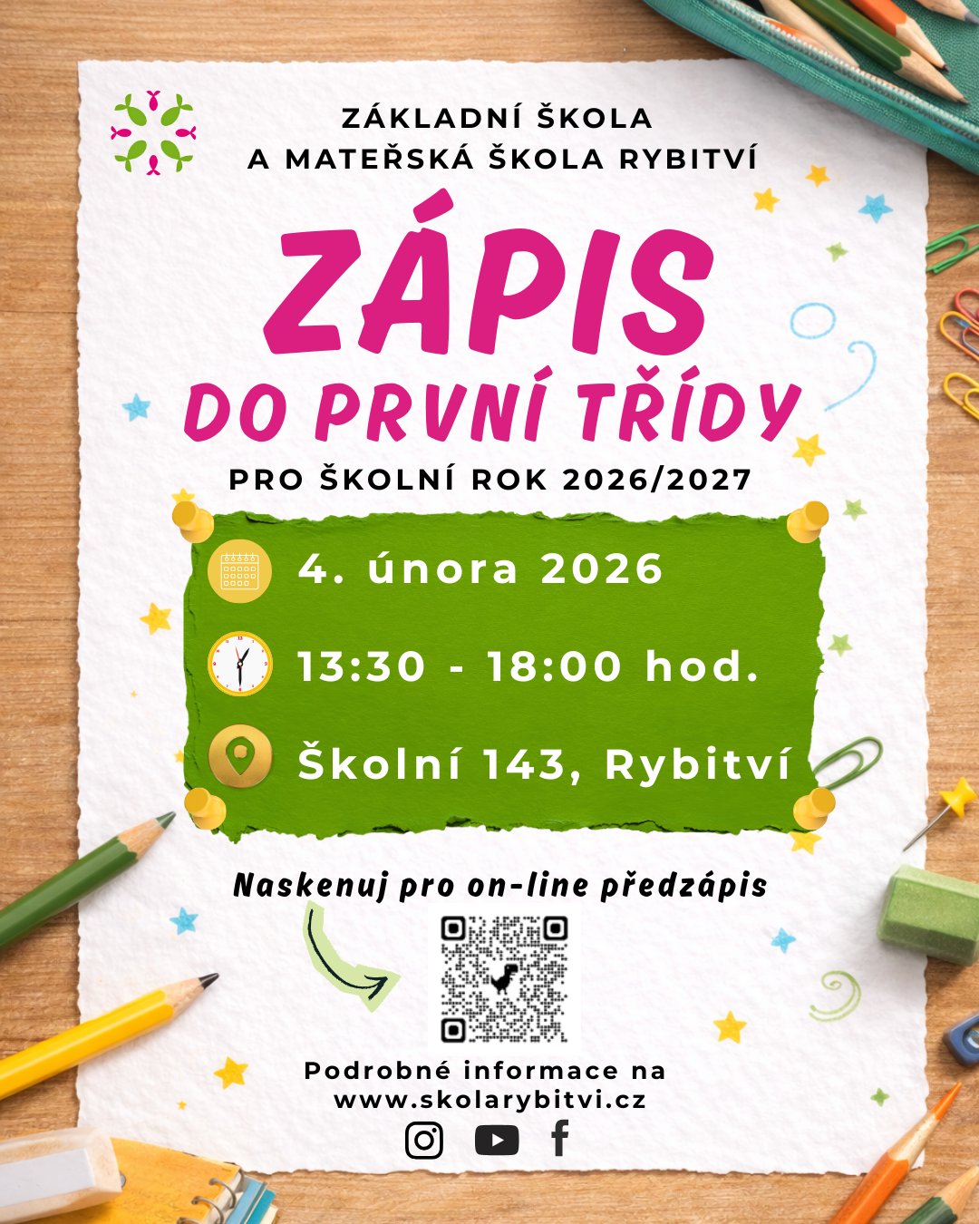 On-line předzápis - https://skolarybitvi.edookit.net/application nebo naskenujte QR kód na letáku.