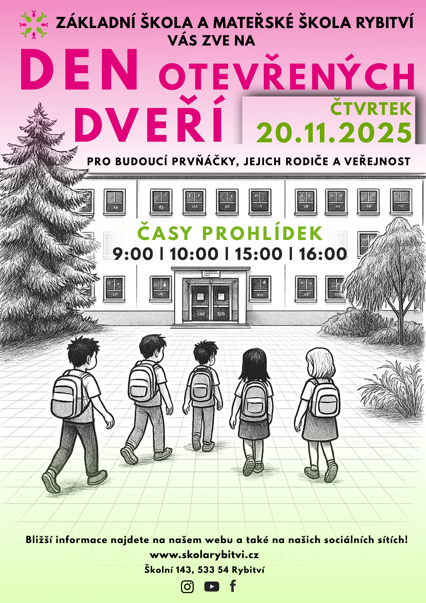20. 11. 2025Zveme všechny budoucí prvňáčky, jejich rodiče i širokou veřejnost na Den otevřených dveří v Základní škole a mateřské škole Rybítví. Přijďte se podívat, jak to u nás vypadá, nahlédnout do výuky, poznat naše učitele a zeptat se na vše, co vás zajímá.